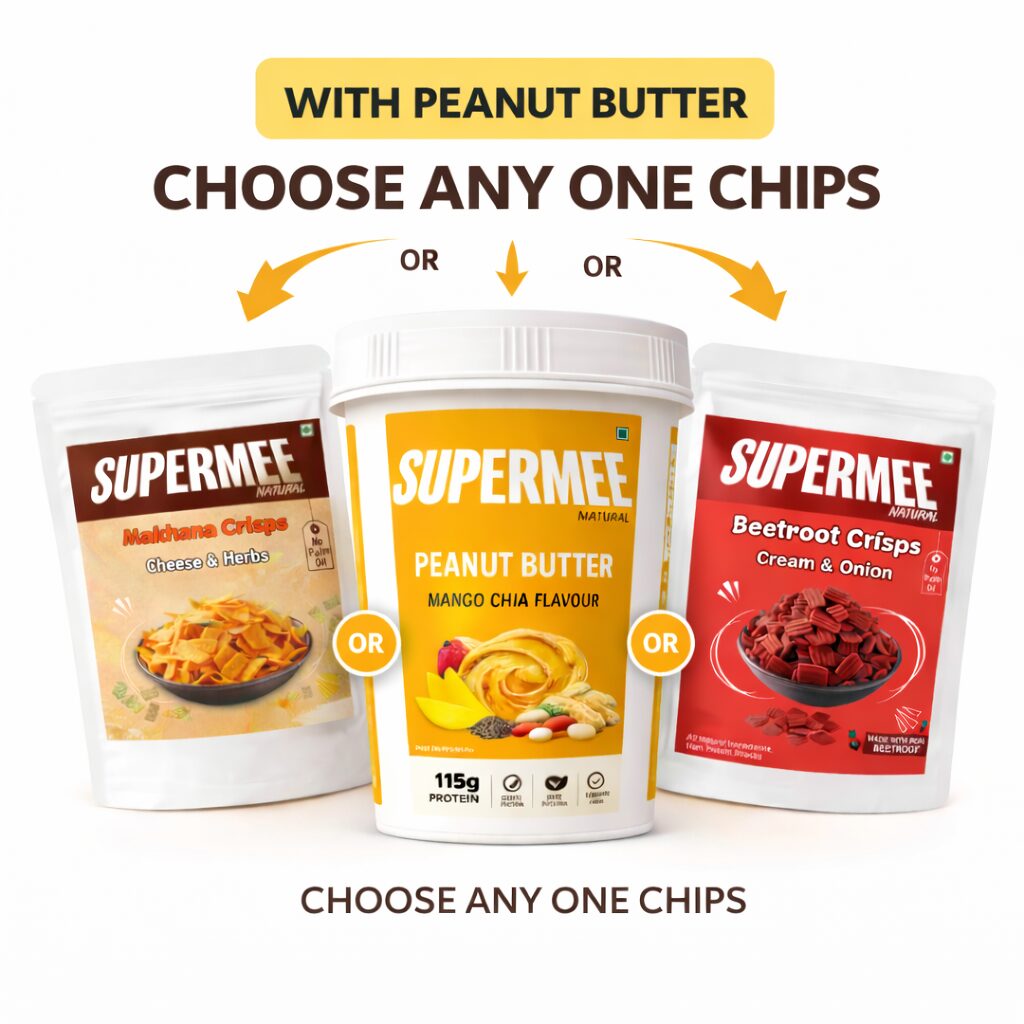 This combo lets you pick any one chips pack to enjoy with our nutritious peanut butter. A perfect snack for tea time, work breaks, or guilt-free munching.